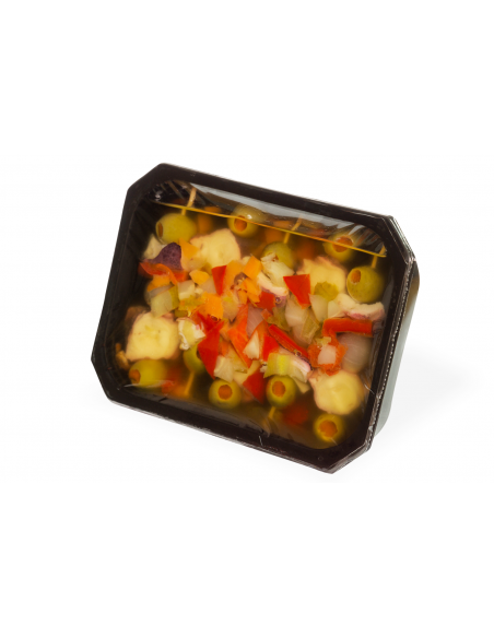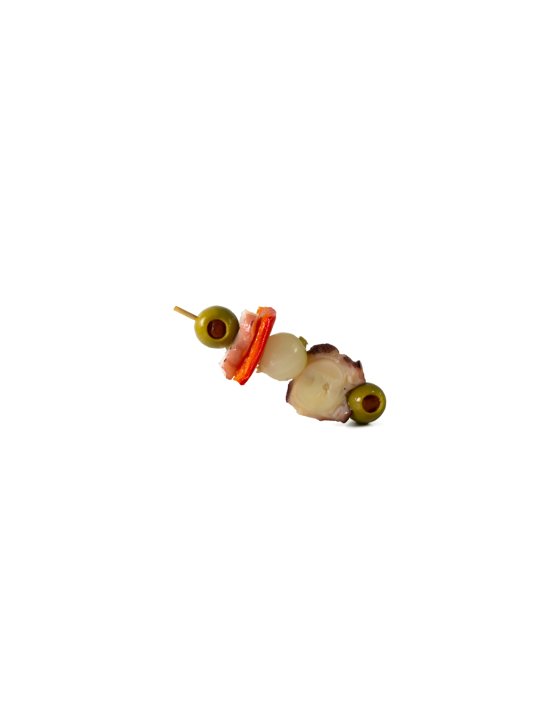 Cohete formado de pulpo, aceituna verde rellena de pimiento rojo, pimiento rojo, cebolleta y vinagreta.