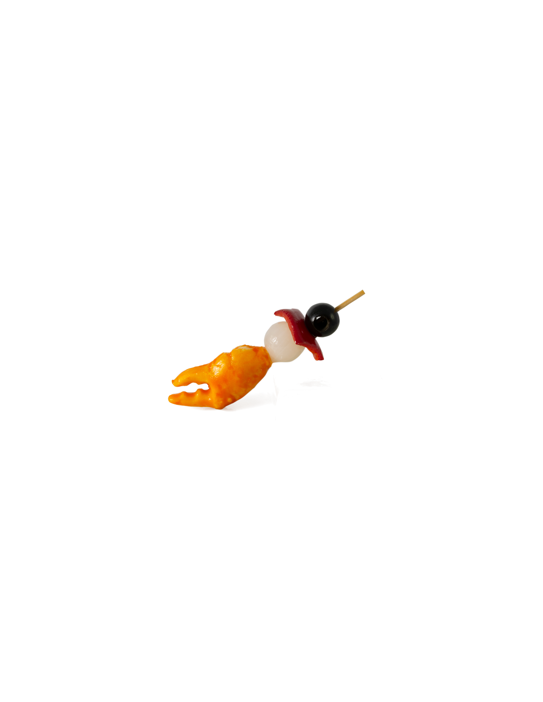 Cohete formado de pinza de cangrejo de surimi, cebolleta en vinagre, pimiento rojo y aceituna negra deshuesada.