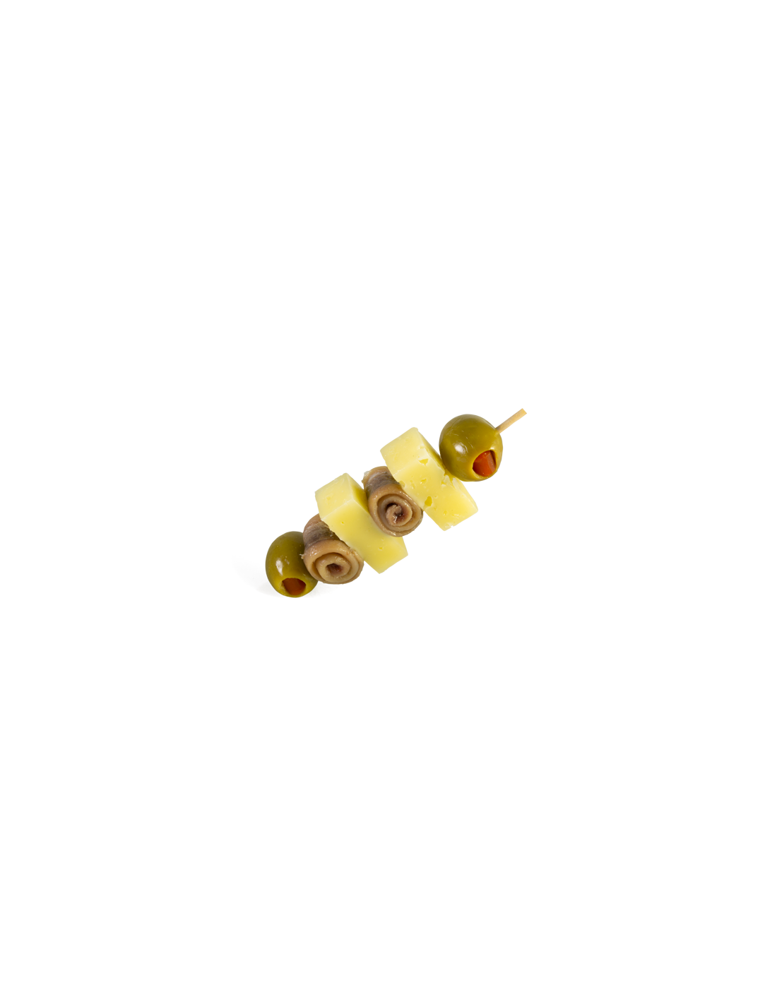 Cohete formado de queso manchego, anchoa en salazón y aceituna verde rellana de pimiento rojo.